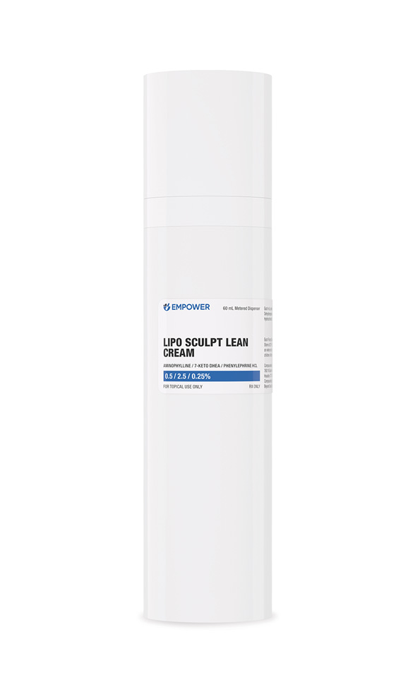 Lipo Sculpt Cream is a customized, prescription-only, transdermal formulation intended to support localized adipose reduction in adults pursuing medically supervised body-recomposition strategies. It is compounded exclusively in a 503A pharmacy and supplied as three related 60 mL preparations: (1) Lipo Sculpt Cream containing 0.5 % aminophylline, (2) Lipo Sculpt Max with 0.5 % aminophylline + 5 % 7-keto DHEA, and (3) Lipo Sculpt Lean with 0.5 % aminophylline + 2.5 % 7-keto DHEA + 0.25 % phenylephrine HCl. These strengths reflect concentrations investigated in controlled and observational studies of topical lipolysis and thermogenesis.[1]